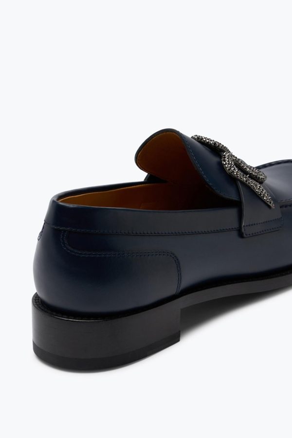The Morgana loafer in dark blue creates a formal and masculine look with a classy touch. With a comfortable fit, it is practical and perfect from the office to a dinner out thanks to the crystal serpent which adds an extra twist.