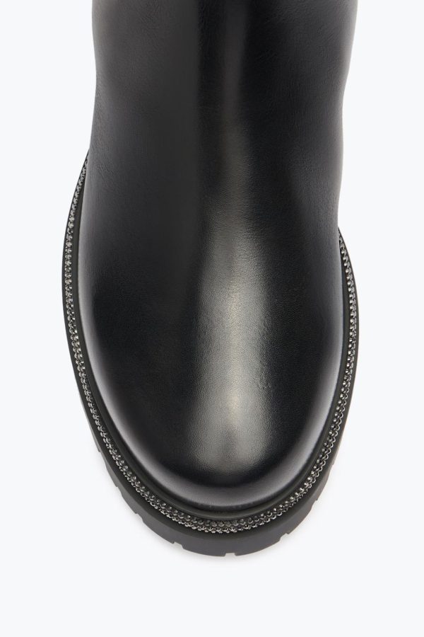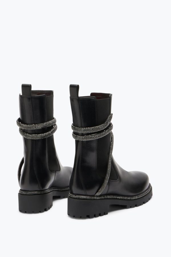 The perfect compromise between a feisty or an urban style with an additional sparkling touch. All of this is represented in these black CLEO COMBAT leather ankle boots. In the design of classic biker boots, with elasticated inserts plus an eyelet on the back that facilitates the fit, plus an iconic spiral with a snakehead terminal that wraps the ankle, slimming the figure. These leather ankle boots feature a silhouette decorated with three rows of matching micro-rhinestones. The treaded sole defines this footwear’s powerful style.