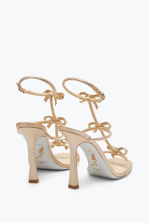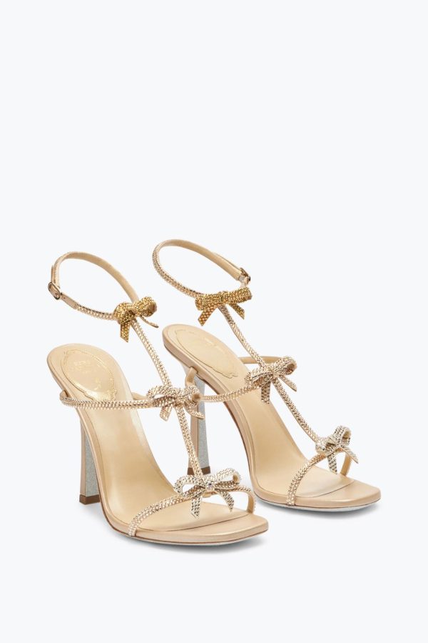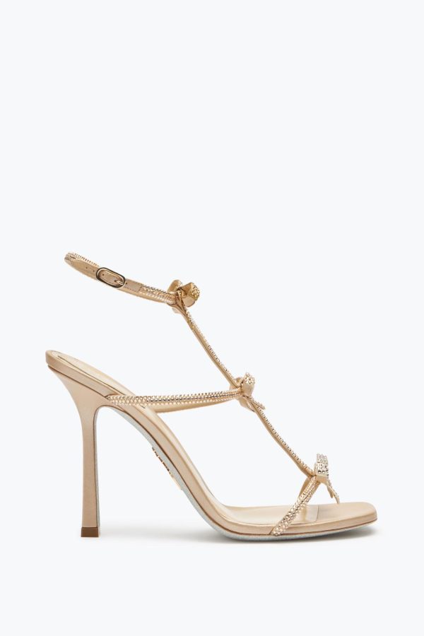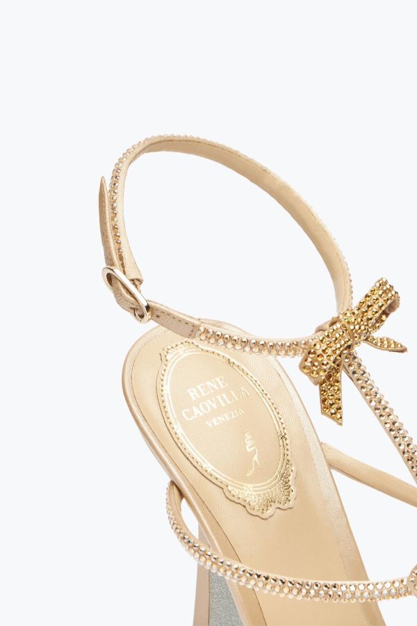The crystal-embellished Caterina sandal is a symbol of feminine seductiveness. Entirely handmade in Italy, this T-strap design is characterized by three dainty ribbons, drizzled with baby crystals that reflect the light elegantly. It is finished with our signature star-dusted sole.– Heel height 4,1– Round toe– Pearlized nappa and satin– Leather sole