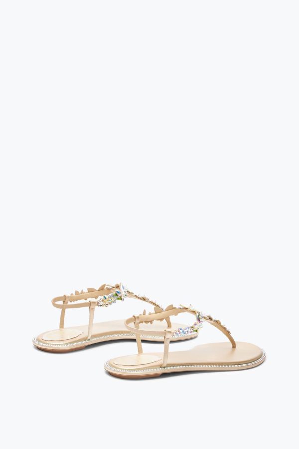The Eden sandal shines bright in the René Caovilla firmament. The thong design is essential and refined. Its particularity is all in the luxurious embellishment made of leather-crafted butterflies and flowers enriched with iridescent crystals, completed with a row of tone-on-tone crystals that runs along its profile.