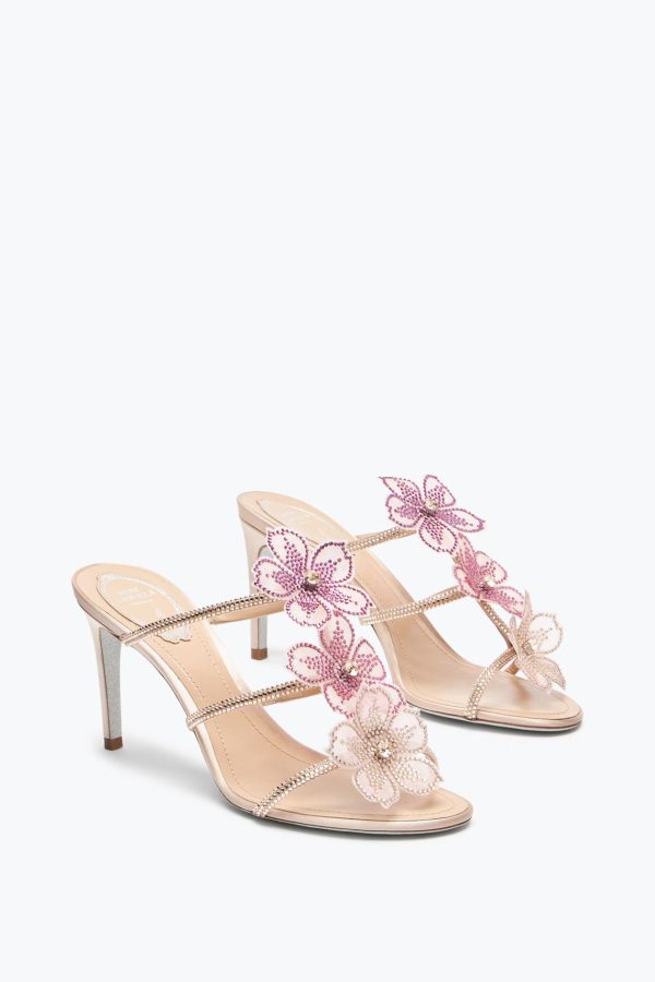 The Peach Flower mule exudes grace and lightness, perfect for spring-summer looks, thanks to its three flowers – each crafted with five lace and tulle petals, adorned with crystals, and delicately placed on the foot in shades ranging from powder pink to bright pink.