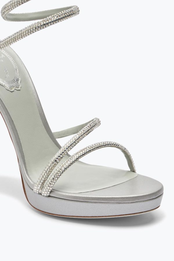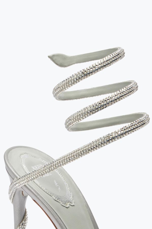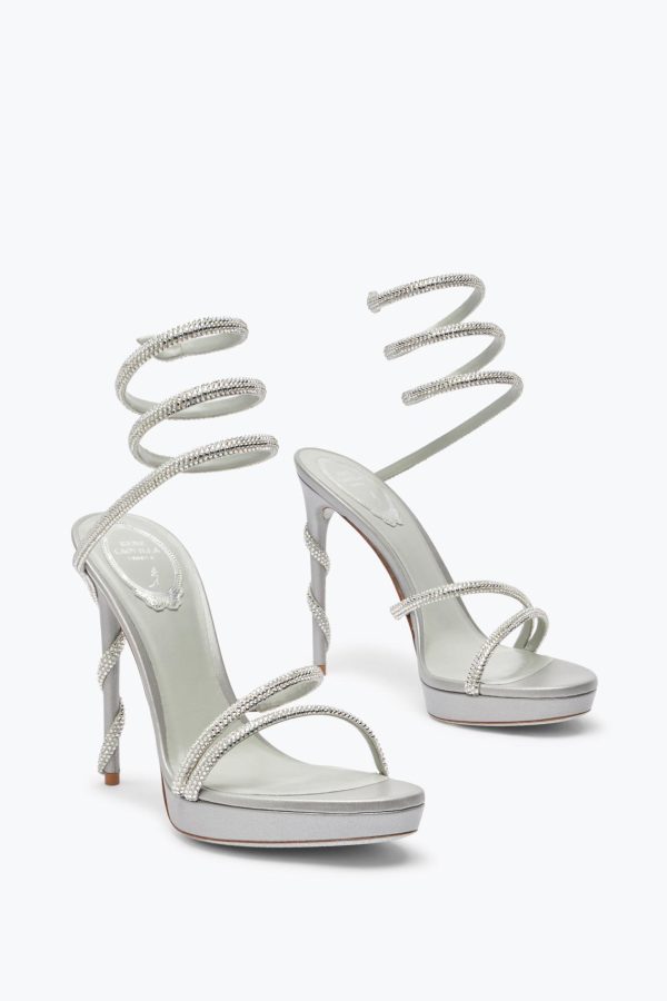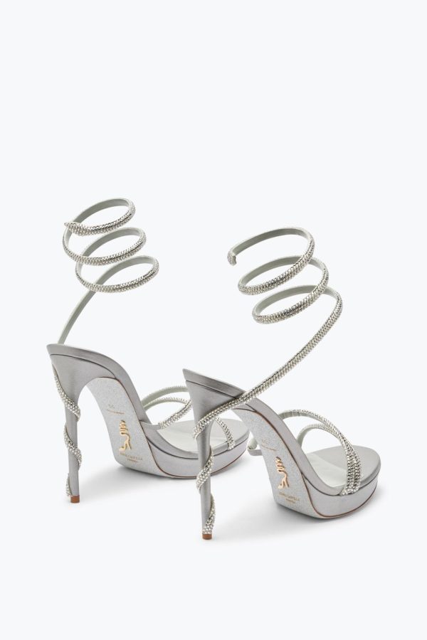 Sculptural design and shimmering details are the distinctive elements of the Margot sandal. In metallic silver, this style stands out for the iconic serpent, embellished with tone-on-tone crystals, and a practical platform that makes the fit comfortable, slims the figure and ensures an effective entrance.