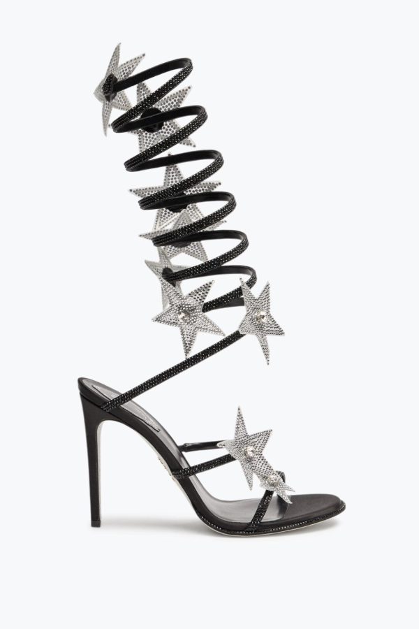 Bright crystal-studded stars embellish the Super Cleo Star sandal’s extra-long serpent. This eye-catching version mixes the black of the upper with the silver of the star detail for a high-impact color-block effect.