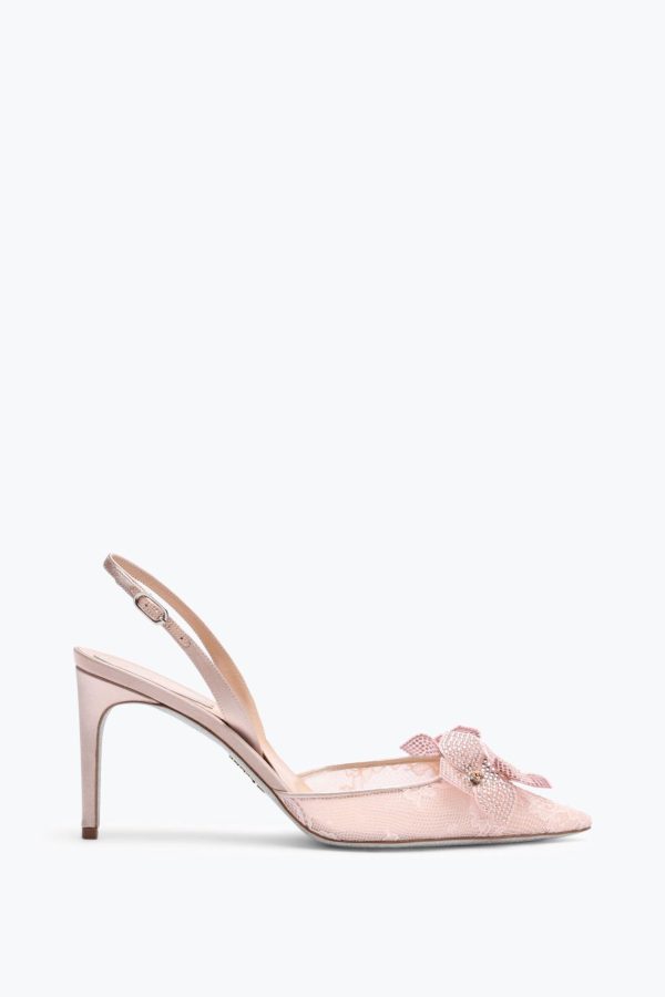 Three features make the Floriane slingback refined yet versatile: the delicate flower embellishment on the toe, the pink color that pairs perfectly with evening looks, and the midi stiletto heel that combines romanticism and charm.