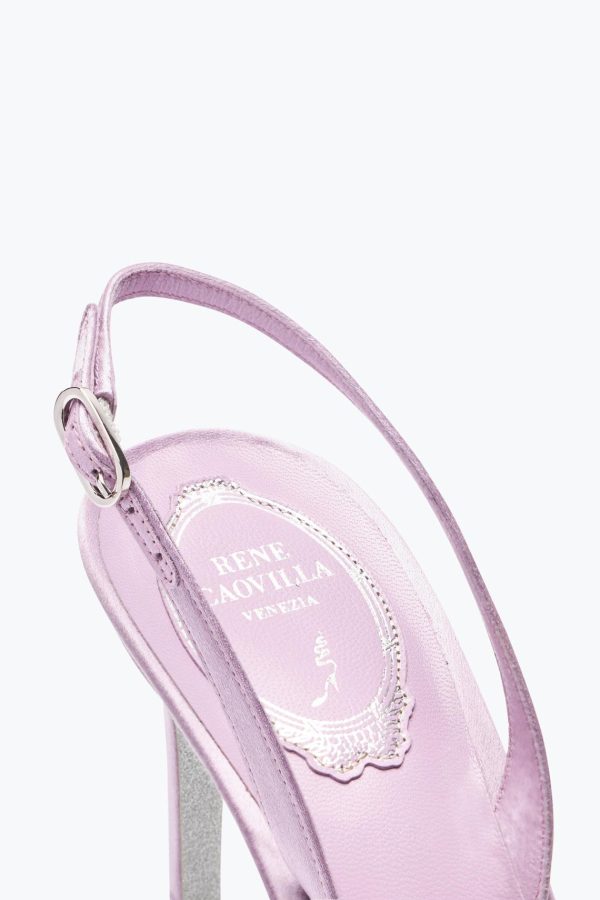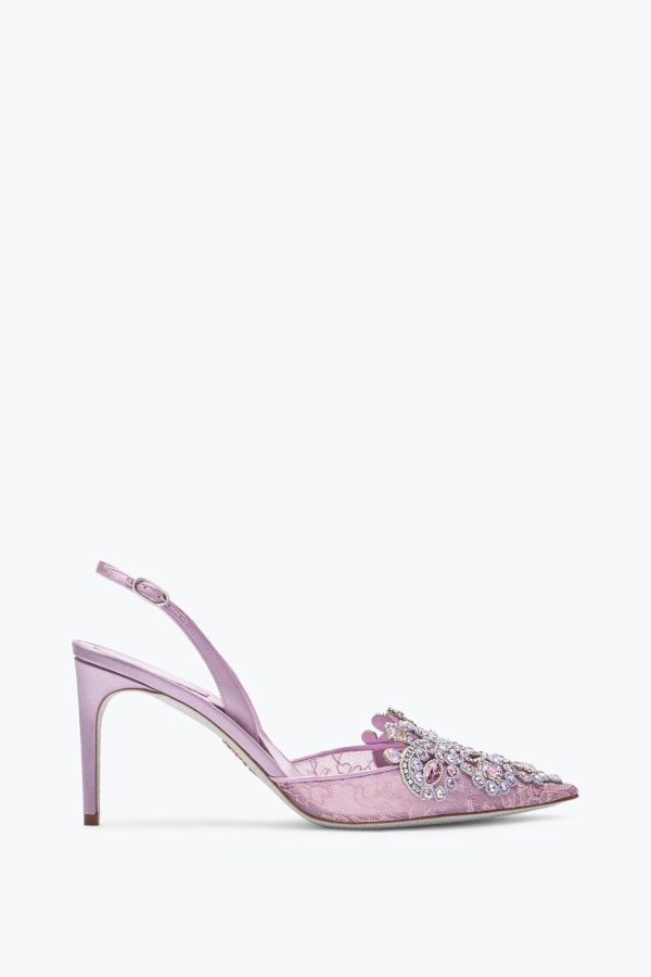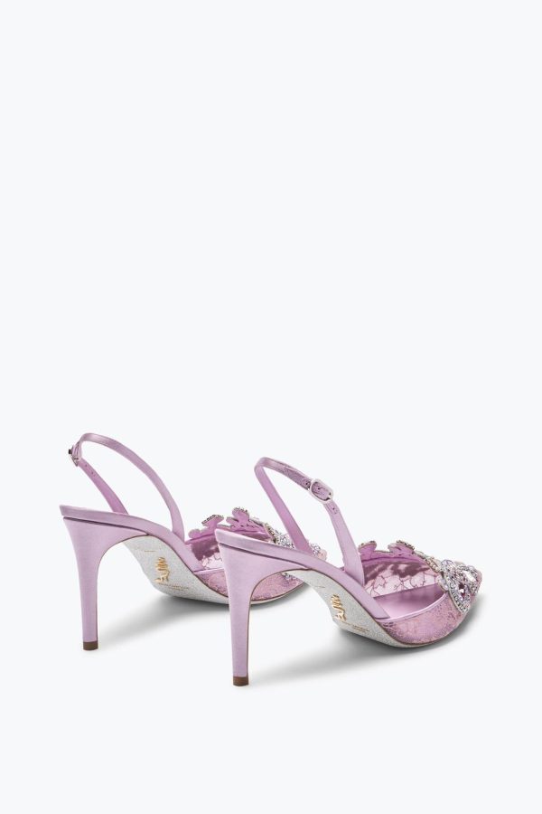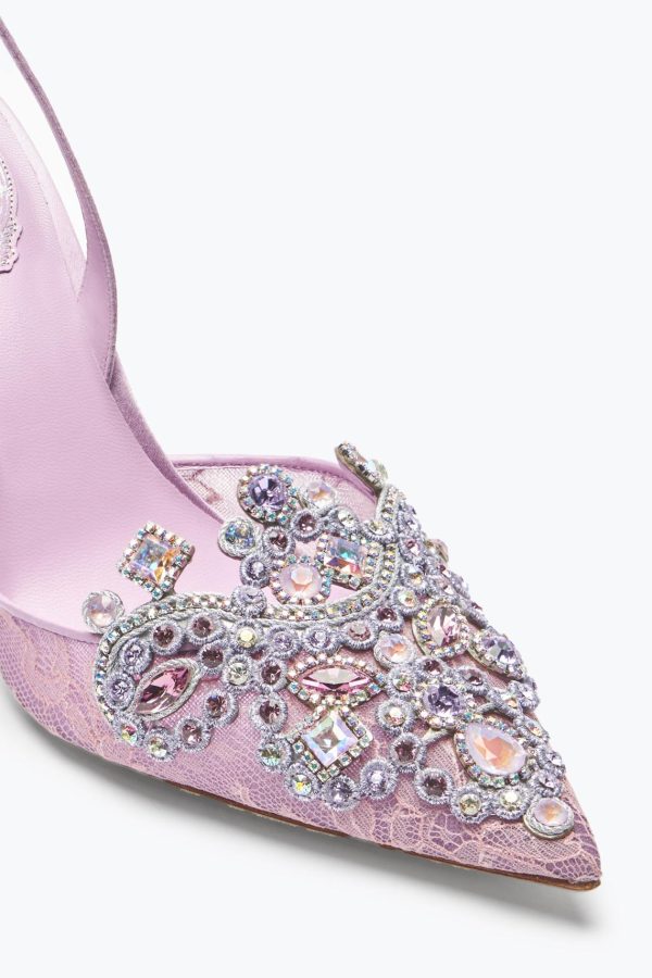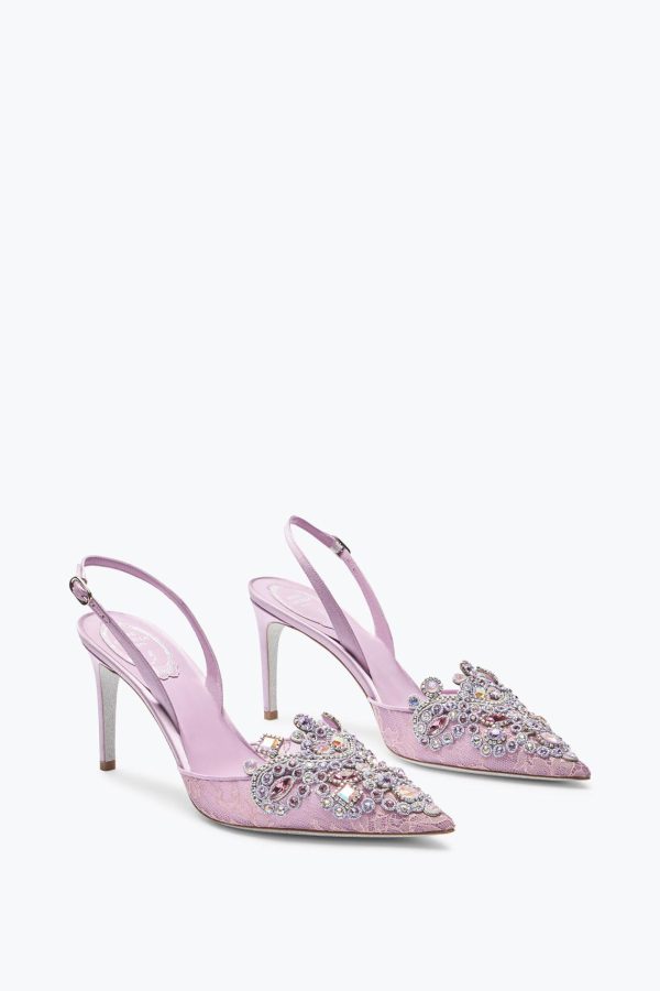 A masterpiece of craftsmanship, the Veneziana slingback recalls the origins of the maison in a triumph of lace and embroidery. In a refined lilac nuance, it stands out for the luxurious decoration on the toe which alternates crystals of different colors and sizes to give brightness and refinement to the most exclusive looks.